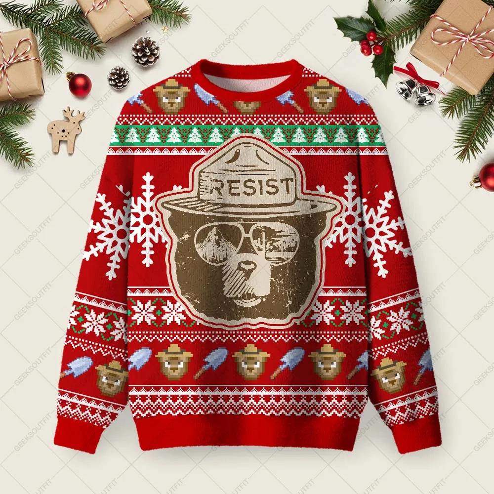 Smokey Bear Ugly Christmas Fuzzy Fleece Sweatshirt